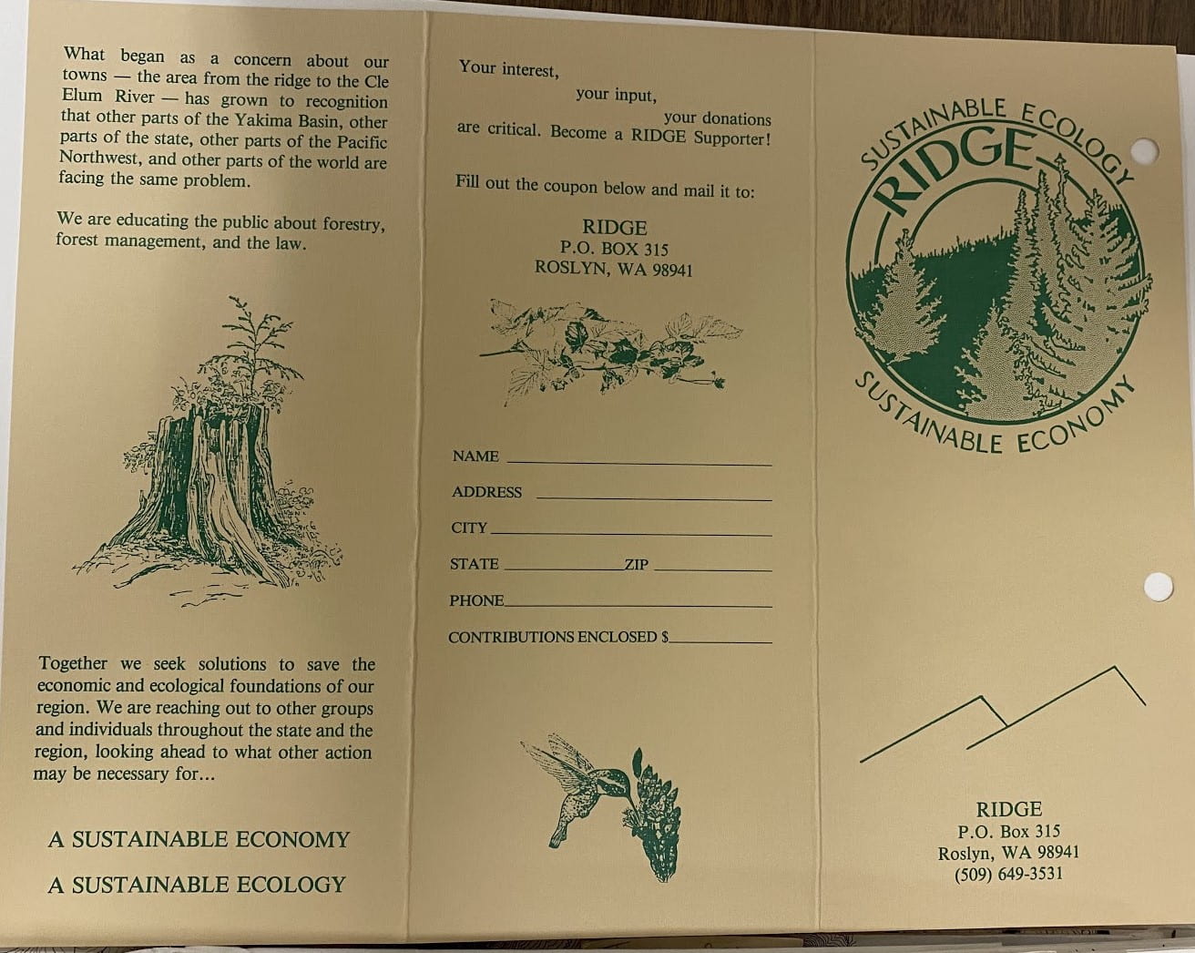 RIDGE’s connection to labor organizing is unique among other environmental groups of the time. Their alignment with the labor movement not only happened in practice through negotiating for union contracts, but through their philosophical positions. RIDGE challenged the notion that extractive economy workers and environmentalists have competing interests, and instead sought to harmonize the need for a sustainable forest economy among workers and those concerned with the environment. RIDGE’s motto, “Sustainable Ecology, Sustainable Economy”, is featured on material throughout the collection, including this pamphlet from RIDGE’s early years.