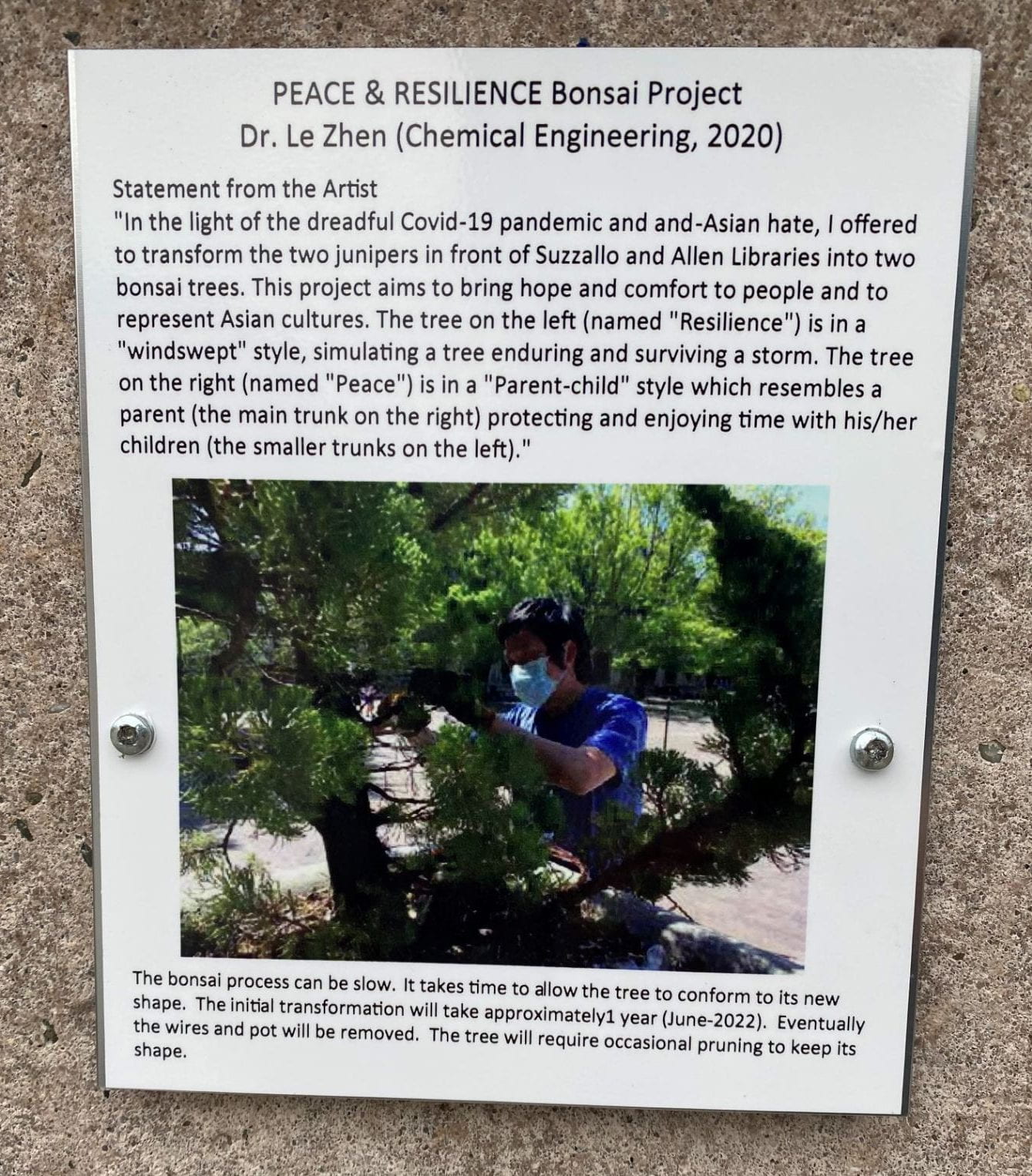 Bonsai trees being created outside UW’s Suzzallo Library – Suzzallo Bonzai as a symbol of peace, resilience, and inclusion through the vision of Dr. Le Shen (UW Chemical Engineering 2020). (Photo Right: A new plaque installed next to the Bonsai trees in front of the Suzzallo Library explains the artist’s vision.