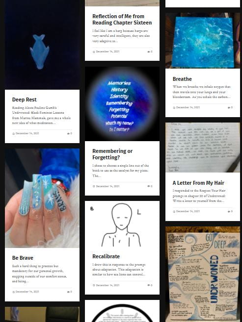 Digital Gallery – Wellbeing, A Community Reflection: – Community Reads fall quarter gallery showcases beautiful, inspiring and emotional artwork, poetry and expressions on the fall quarter themes self-care, breath, and reflection based on this year’s book: Undrowned by Alexis Pauline Gumbs, a collection of meditations inspired by marine mammals, to seek ways we can all breathe easier, individually and together. View the gallery, and learn more about Community Reads.